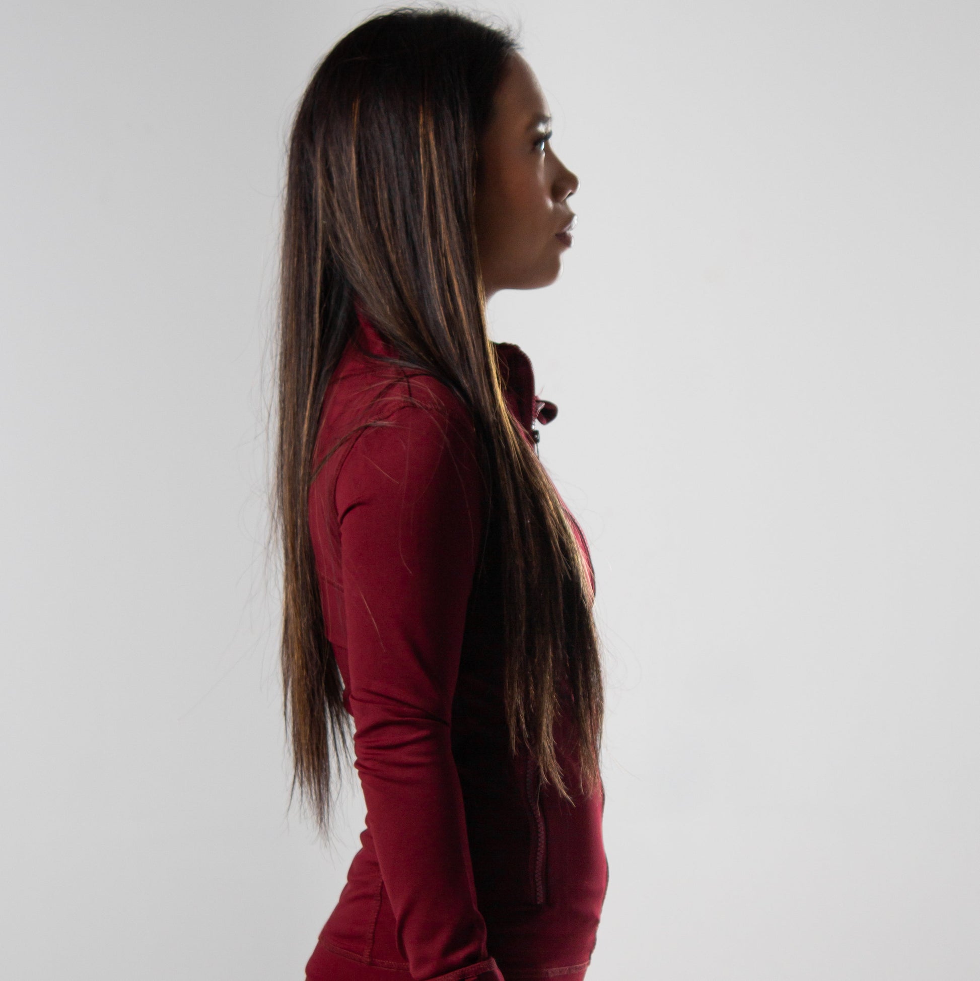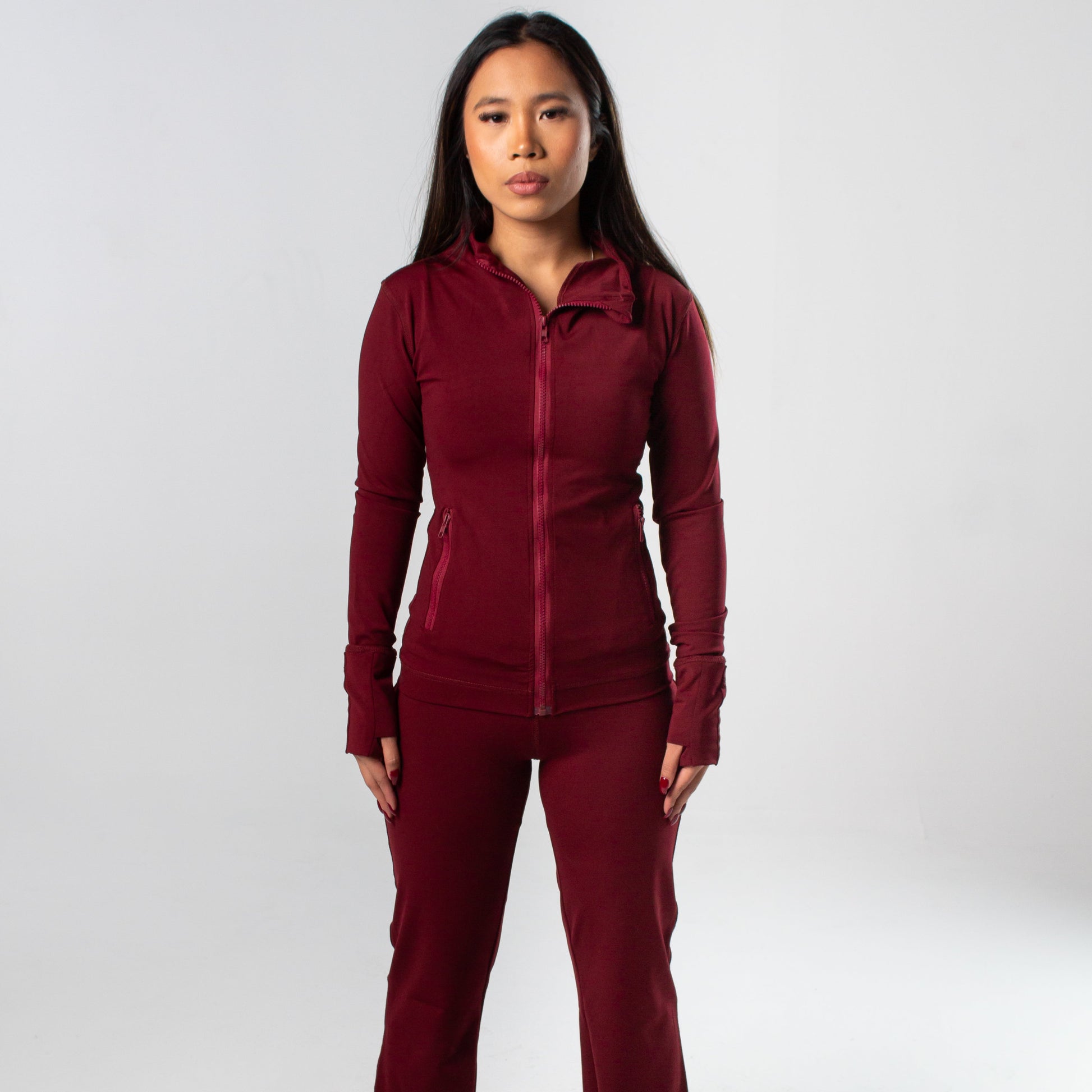 Feel & Function: Smooth, sculpting fit that defines your waist, with built-in thumb holes and clean zipper detailing for comfort and edge.